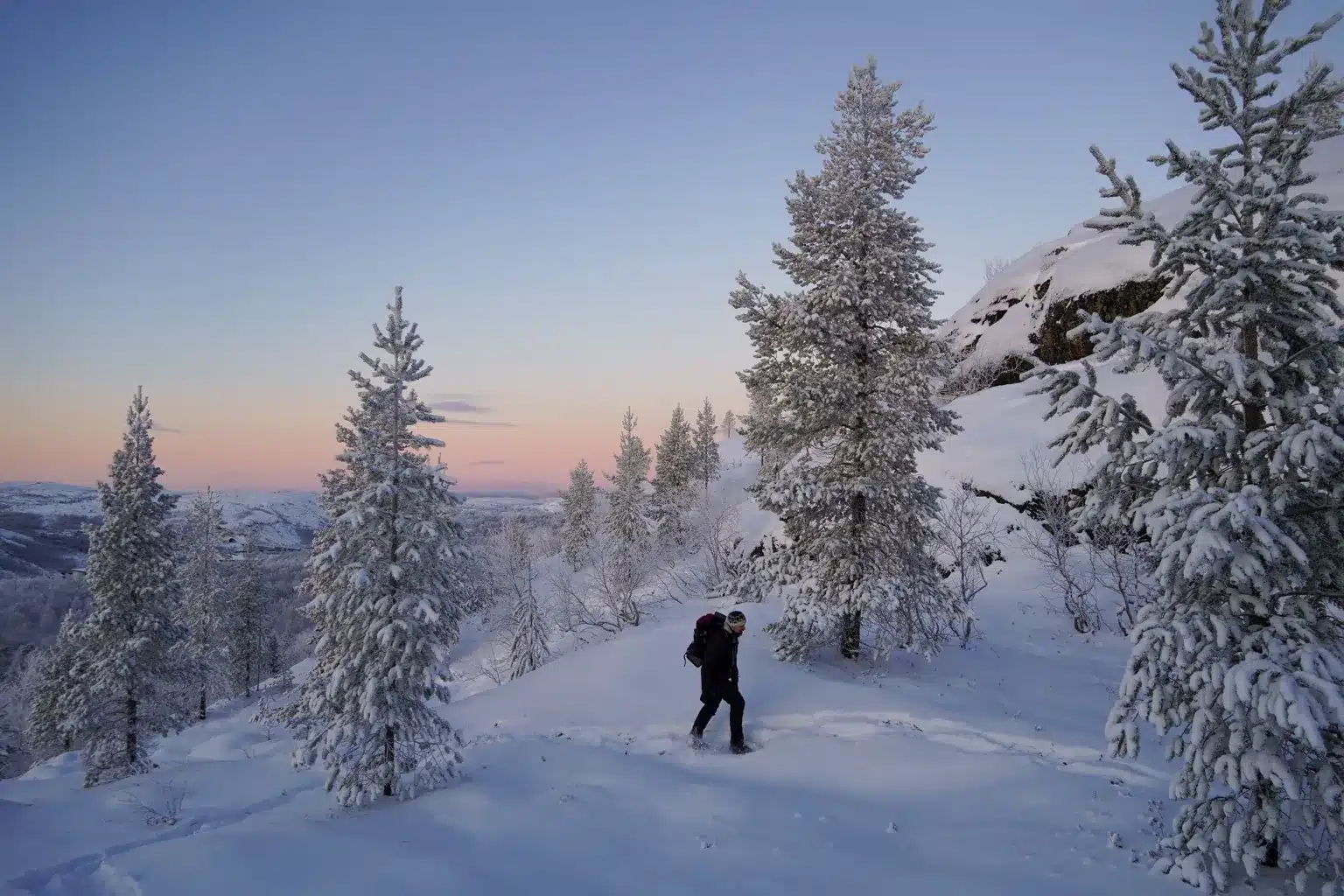 Crunch through snow under the stars as the Northern Lights dance above. A peaceful night hike far from the city lights — just you, the snow, and the sky.