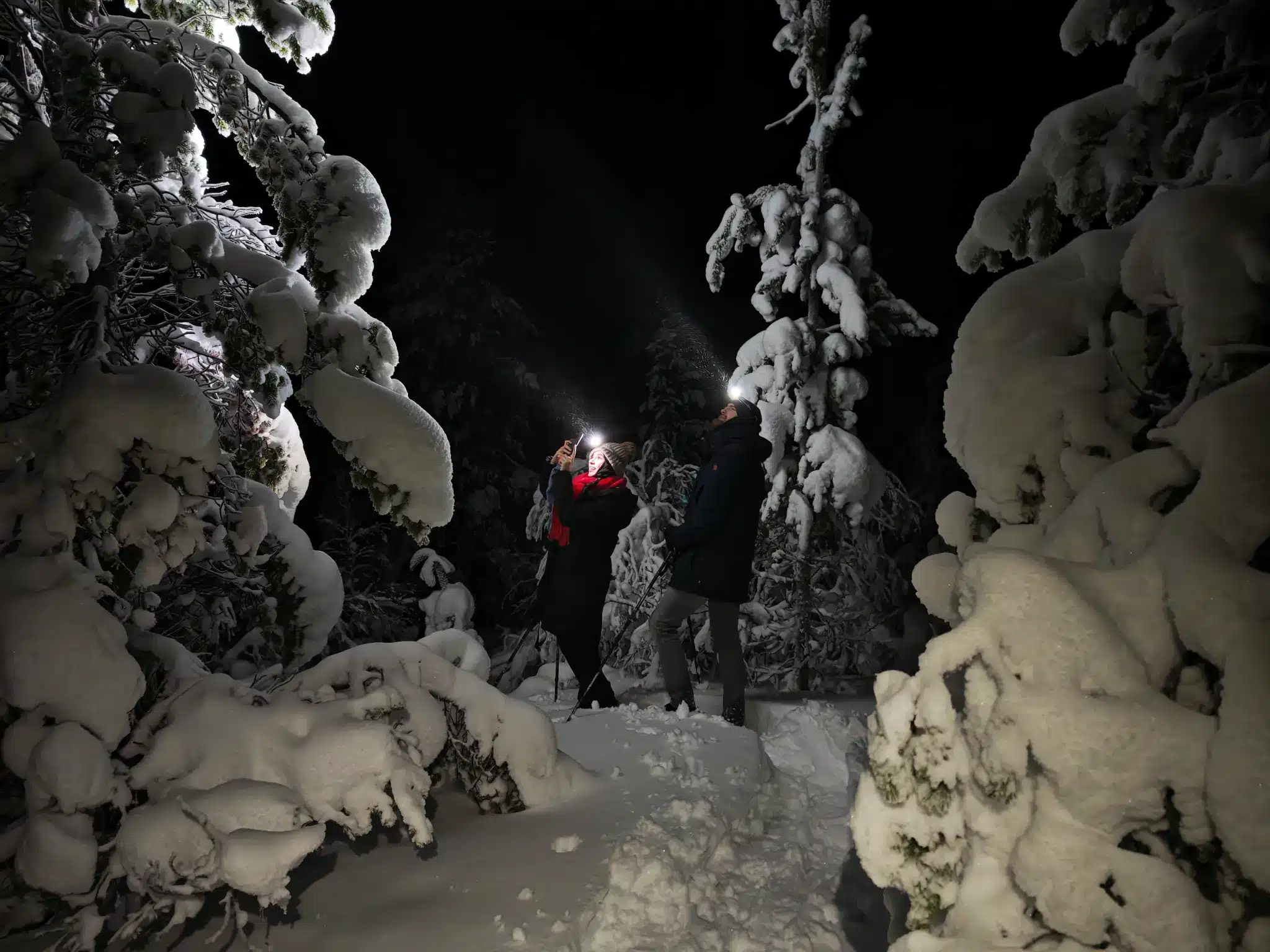 Crunch through snow under the stars as the Northern Lights dance above. A peaceful night hike far from the city lights — just you, the snow, and the sky.