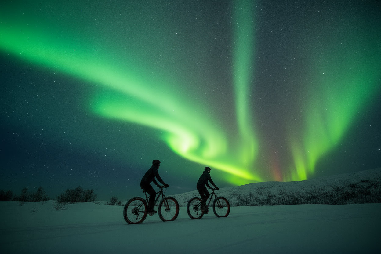 Imagine cycling through the Arctic wilderness in winter: the only sound you hear is the snow crunching under your tires. With oversized wheels and electric assistance, fat bikes make it possible to float across frozen lakes and snow-covered trails with surprising ease. On this guided tour, you’ll ride through quiet forests, icy landscapes, and open views of the surrounding fjords. Your guide will set a pace that fits the group and share stories about Arctic life, wildlife, and history along the way. We’ll stop for hot drinks in the snow — and if you join an evening departure, the northern lights may dance above as you ride across the frozen landscape.