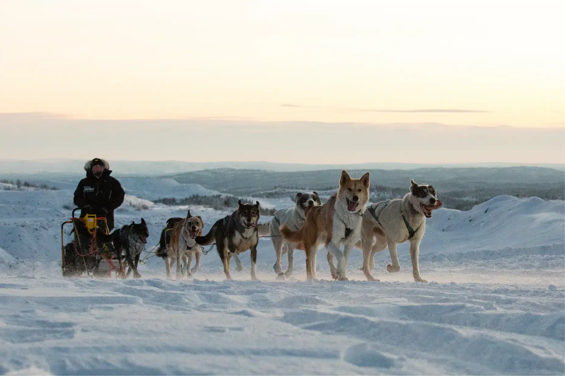 The tour usually starts with tandem sleds, where two sleds are connected. This allows you to get familiar with the dogs and terrain together with a guide or partner. During the journey, you travel through endless pine forests, frozen lakes, and untouched Arctic wilderness on quiet dog trails — not busy snowmobile routes. If conditions allow, the sleds can be separated during the break, giving you the opportunity to drive your own dog team independently on the return leg.